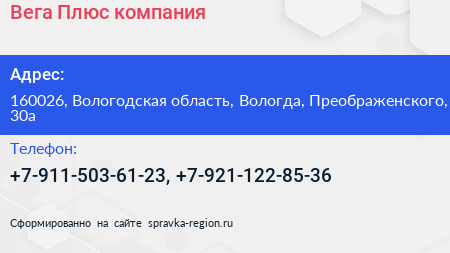 Вега Плюс, компания по адресу 160026, Вологодская область, Вологда, Преображенского, 30а в дальнейшем Организация, размещена в следующих категориях: