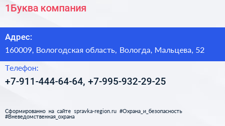 1Буква, компания по адресу 160009, Вологодская область, Вологда, Мальцева, 52 в дальнейшем Организация, размещена в следующих категориях: