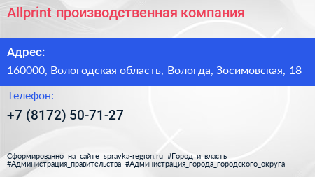 Allprint, производственная компания по адресу 160000, Вологодская область, Вологда, Зосимовская, 18 в дальнейшем Организация, размещена в следующих категориях: