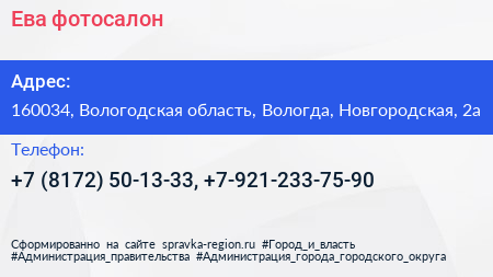 Ева, фотосалон по адресу 160034, Вологодская область, Вологда, Новгородская, 2а в дальнейшем Организация, размещена в следующих категориях: