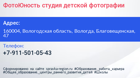 ФотоЮность, студия детской фотографии по адресу 160004, Вологодская область, Вологда, Благовещенская, 47 в дальнейшем Организация, размещена в следующих категориях: