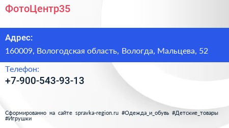 ФотоЦентр35 по адресу 160009, Вологодская область, Вологда, Мальцева, 52 в дальнейшем Организация, размещена в следующих категориях: