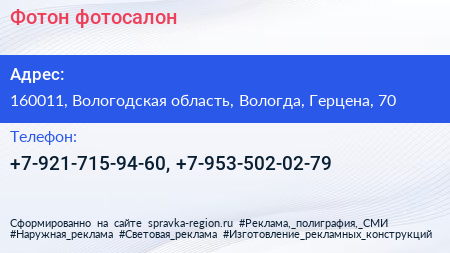 Фотон, фотосалон по адресу 160011, Вологодская область, Вологда, Герцена, 70 в дальнейшем Организация, размещена в следующих категориях: