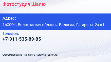 Фотостудия Шалю по адресу 160004, Вологодская область, Вологда, Гагарина, 2а к1 в дальнейшем Организация, размещена в следующих категориях: