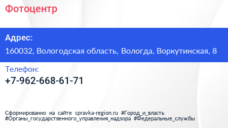 Фотоцентр по адресу 160032, Вологодская область, Вологда, Воркутинская, 8 в дальнейшем Организация, размещена в следующих категориях: