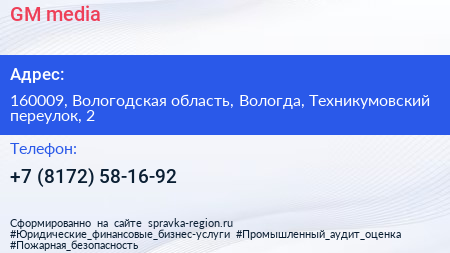 GM-media по адресу 160009, Вологодская область, Вологда, Техникумовский переулок, 2 в дальнейшем Организация, размещена в следующих категориях: