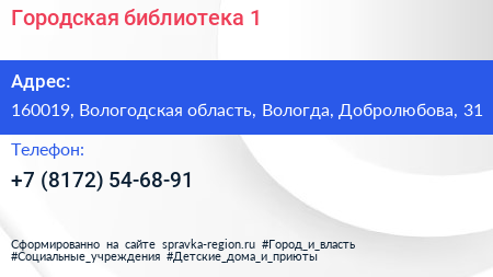 Городская библиотека №1 по адресу 160019, Вологодская область, Вологда, Добролюбова, 31 в дальнейшем Организация, размещена в следующих категориях: