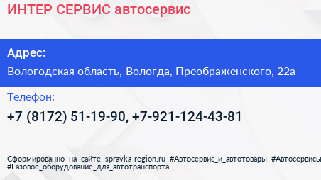 ИНТЕР-СЕРВИС, автосервис по адресу Вологодская область, Вологда, Преображенского, 22а в дальнейшем Организация, размещена в следующих категориях: