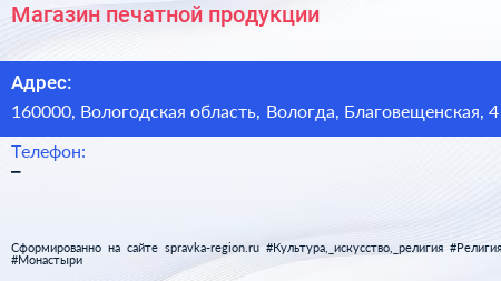 Магазин печатной продукции по адресу 160000, Вологодская область, Вологда, Благовещенская, 4 в дальнейшем Организация, размещена в следующих категориях: