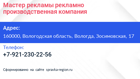 Мастер рекламы, рекламно-производственная компания по адресу 160000, Вологодская область, Вологда, Зосимовская, 17 в дальнейшем Организация, размещена в следующих категориях: