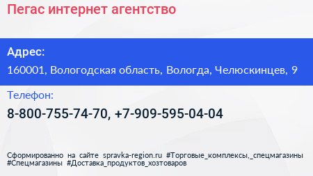 Пегас, интернет-агентство по адресу 160001, Вологодская область, Вологда, Челюскинцев, 9 в дальнейшем Организация, размещена в следующих категориях:
