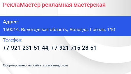 РеклаМастер, рекламная мастерская по адресу 160014, Вологодская область, Вологда, Гоголя, 110 в дальнейшем Организация, размещена в следующих категориях: