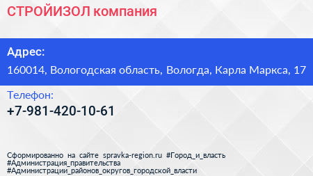 СТРОЙИЗОЛ, компания по адресу 160014, Вологодская область, Вологда, Карла Маркса, 17 в дальнейшем Организация, размещена в следующих категориях: