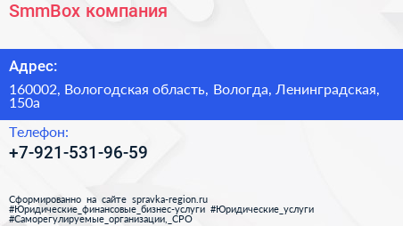 SmmBox, компания по адресу 160002, Вологодская область, Вологда, Ленинградская, 150а в дальнейшем Организация, размещена в следующих категориях:
