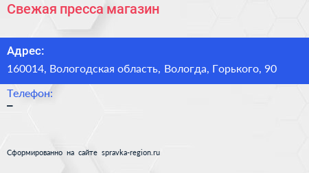 Свежая пресса, магазин по адресу 160014, Вологодская область, Вологда, Горького, 90 в дальнейшем Организация, размещена в следующих категориях:
