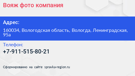 Вояж фото, компания по адресу 160034, Вологодская область, Вологда, Ленинградская, 95а в дальнейшем Организация, размещена в следующих категориях: