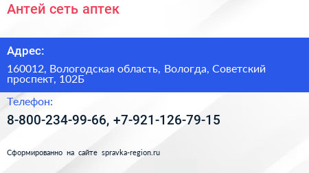 Антей, сеть аптек по адресу 160012, Вологодская область, Вологда, Советский проспект, 102Б в дальнейшем Организация, размещена в следующих категориях: