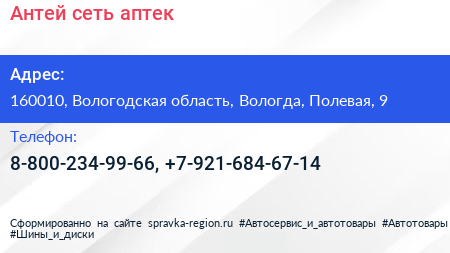 Антей, сеть аптек по адресу 160010, Вологодская область, Вологда, Полевая, 9 в дальнейшем Организация, размещена в следующих категориях: