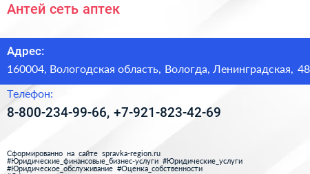 Антей, сеть аптек по адресу 160004, Вологодская область, Вологда, Ленинградская, 48 в дальнейшем Организация, размещена в следующих категориях: