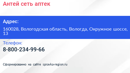 Антей, сеть аптек по адресу 160028, Вологодская область, Вологда, Окружное шоссе, 13 в дальнейшем Организация, размещена в следующих категориях: