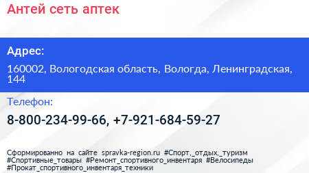 Антей, сеть аптек по адресу 160002, Вологодская область, Вологда, Ленинградская, 144 в дальнейшем Организация, размещена в следующих категориях: