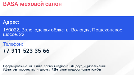 BASA, меховой салон по адресу 160022, Вологодская область, Вологда, Пошехонское шоссе, 22 в дальнейшем Организация, размещена в следующих категориях: