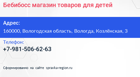 Бебибосс, магазин товаров для детей по адресу 160000, Вологодская область, Вологда, Козлёнская, 3 в дальнейшем Организация, размещена в следующих категориях: