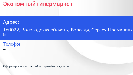 Экономный, гипермаркет по адресу 160022, Вологодская область, Вологда, Сергея Преминина, 8 в дальнейшем Организация, размещена в следующих категориях:
