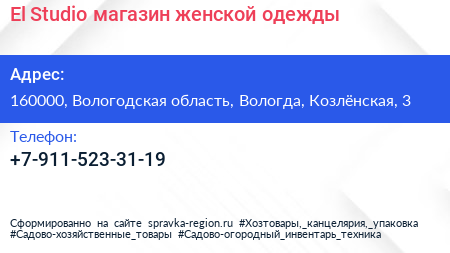 El Studio, магазин женской одежды по адресу 160000, Вологодская область, Вологда, Козлёнская, 3 в дальнейшем Организация, размещена в следующих категориях: