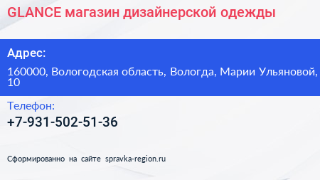 GLANCE, магазин дизайнерской одежды по адресу 160000, Вологодская область, Вологда, Марии Ульяновой, 10 в дальнейшем Организация, размещена в следующих категориях: