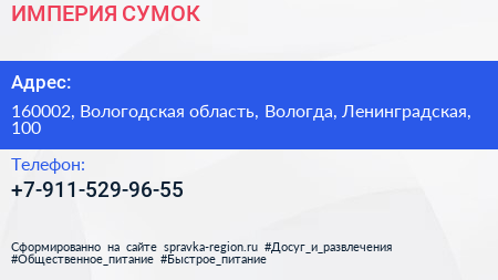 ИМПЕРИЯ СУМОК по адресу 160002, Вологодская область, Вологда, Ленинградская, 100 в дальнейшем Организация, размещена в следующих категориях:
