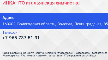 ИНКАНТО, итальянская химчистка по адресу 160002, Вологодская область, Вологда, Ленинградская, 85 в дальнейшем Организация, размещена в следующих категориях: