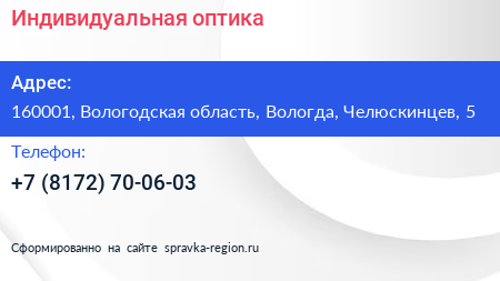 Индивидуальная оптика по адресу 160001, Вологодская область, Вологда, Челюскинцев, 5 в дальнейшем Организация, размещена в следующих категориях: