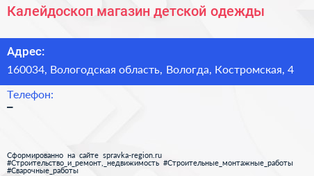 Калейдоскоп, магазин детской одежды по адресу 160034, Вологодская область, Вологда, Костромская, 4 в дальнейшем Организация, размещена в следующих категориях: