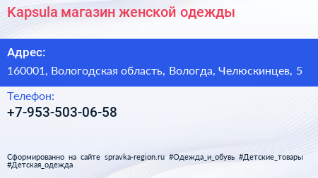 Kapsula, магазин женской одежды по адресу 160001, Вологодская область, Вологда, Челюскинцев, 5 в дальнейшем Организация, размещена в следующих категориях: