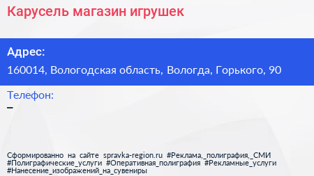 Карусель, магазин игрушек по адресу 160014, Вологодская область, Вологда, Горького, 90 в дальнейшем Организация, размещена в следующих категориях: