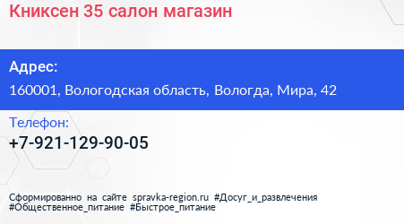 Книксен 35, салон-магазин по адресу 160001, Вологодская область, Вологда, Мира, 42 в дальнейшем Организация, размещена в следующих категориях: