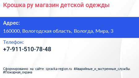 Крошка.ру, магазин детской одежды по адресу 160000, Вологодская область, Вологда, Мира, 3 в дальнейшем Организация, размещена в следующих категориях:
