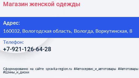 Магазин женской одежды по адресу 160032, Вологодская область, Вологда, Воркутинская, 8 в дальнейшем Организация, размещена в следующих категориях: