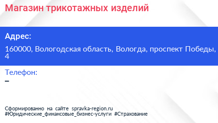 Магазин трикотажных изделий по адресу 160000, Вологодская область, Вологда, проспект Победы, 4 в дальнейшем Организация, размещена в следующих категориях: