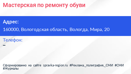 Мастерская по ремонту обуви по адресу 160000, Вологодская область, Вологда, Мира, 20 в дальнейшем Организация, размещена в следующих категориях: