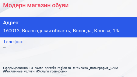 Модерн, магазин обуви по адресу 160013, Вологодская область, Вологда, Конева, 14а в дальнейшем Организация, размещена в следующих категориях: