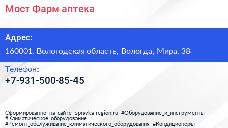 Мост-Фарм, аптека по адресу 160001, Вологодская область, Вологда, Мира, 38 в дальнейшем Организация, размещена в следующих категориях: