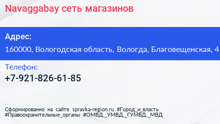 Navaggabay, сеть магазинов по адресу 160000, Вологодская область, Вологда, Благовещенская, 4 в дальнейшем Организация, размещена в следующих категориях: