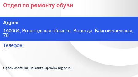 Отдел по ремонту обуви по адресу 160004, Вологодская область, Вологда, Благовещенская, 78 в дальнейшем Организация, размещена в следующих категориях: