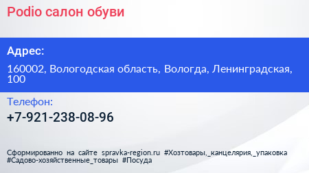 Podio, салон обуви по адресу 160002, Вологодская область, Вологда, Ленинградская, 100 в дальнейшем Организация, размещена в следующих категориях: