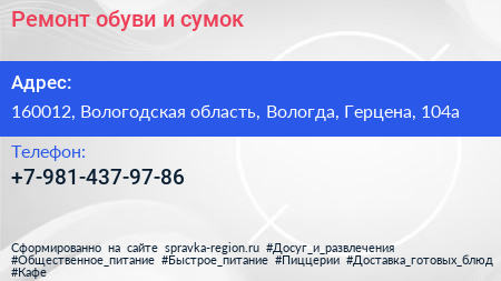 Ремонт обуви и сумок по адресу 160012, Вологодская область, Вологда, Герцена, 104а в дальнейшем Организация, размещена в следующих категориях: