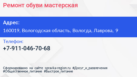 Ремонт обуви, мастерская по адресу 160019, Вологодская область, Вологда, Лаврова, 9 в дальнейшем Организация, размещена в следующих категориях: