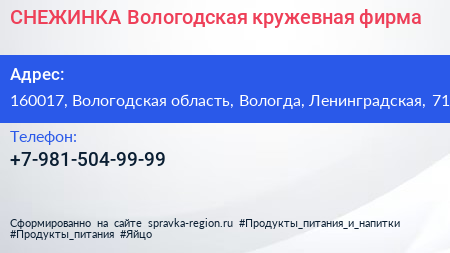 СНЕЖИНКА, Вологодская кружевная фирма по адресу 160017, Вологодская область, Вологда, Ленинградская, 71 в дальнейшем Организация, размещена в следующих категориях: