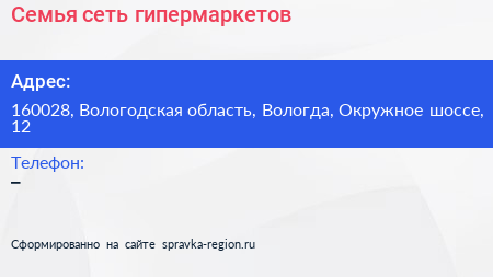 Семья, сеть гипермаркетов по адресу 160028, Вологодская область, Вологда, Окружное шоссе, 12 в дальнейшем Организация, размещена в следующих категориях: